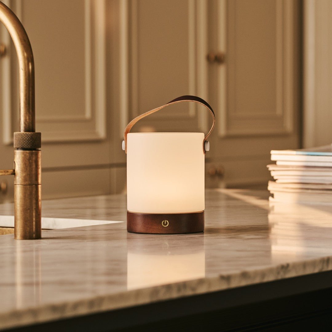 Avery donkerbruine oplaadbare houten tafellamp – draadloos en dimbaar met leren band