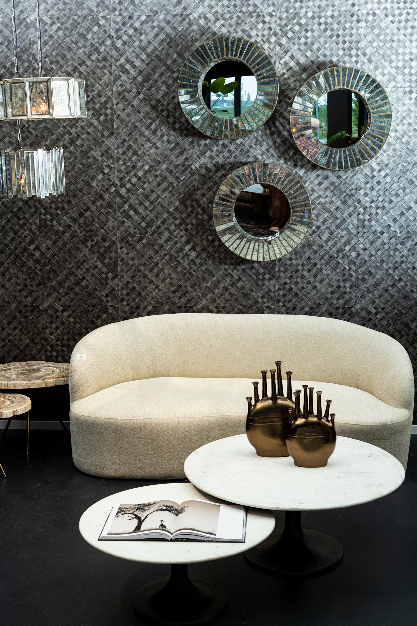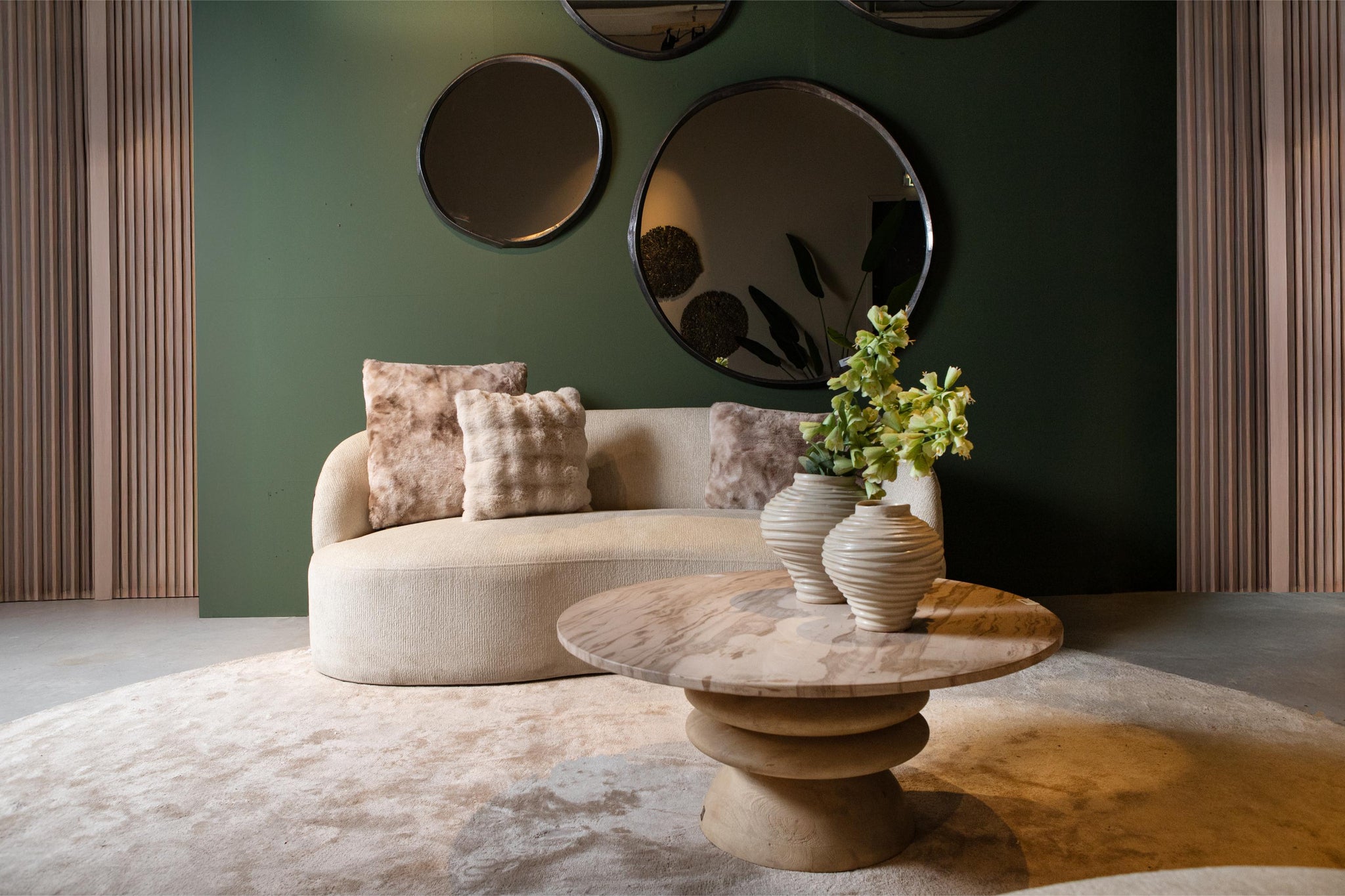 Combineer de Bean Crème bank met zachte kussens in natuurlijke tinten en een warm vloerkleed voor een gezellige, organische sfeer. De asymmetrische vorm maakt deze bank perfect als statement piece in moderne en vintage interieurs.