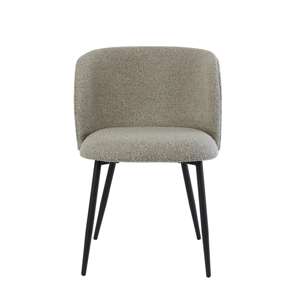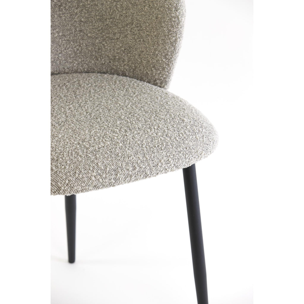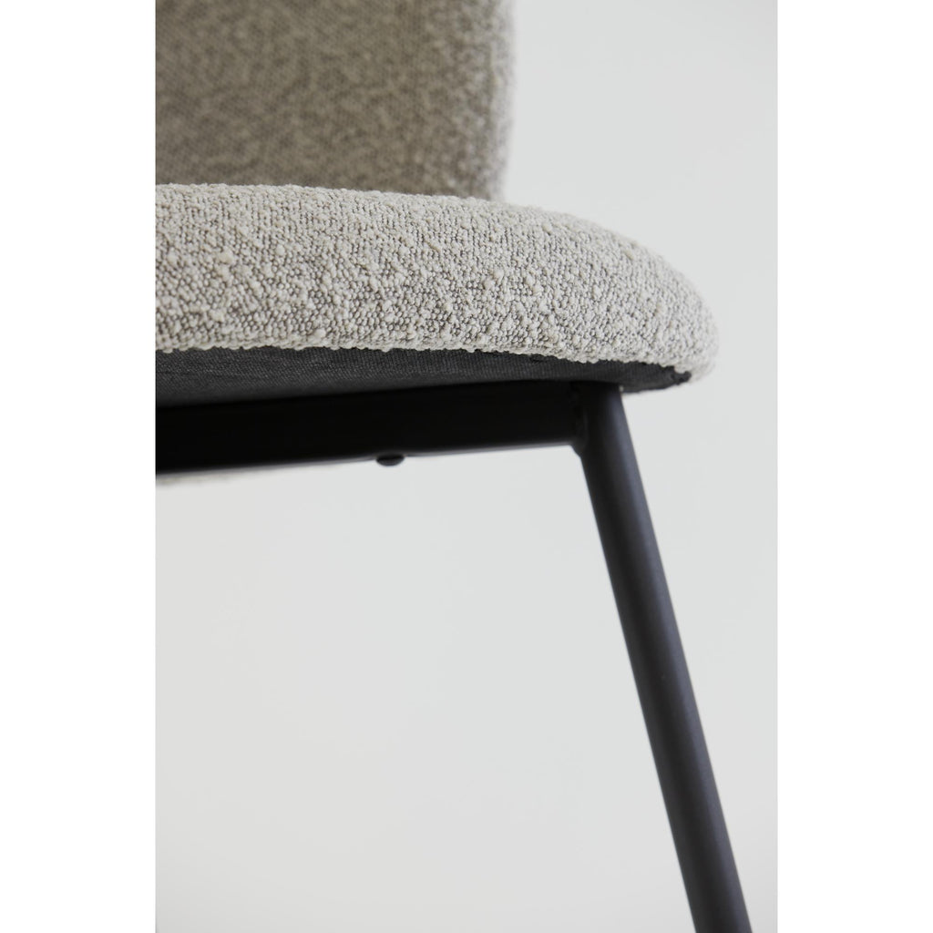 Set of two dining chairs with gray bouclé fabric and black metal base. These elegant dining chairs...