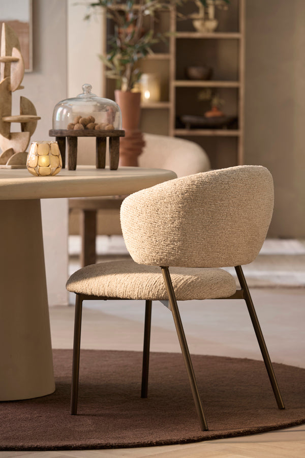 Combineer de Tibalt stoel met natuurlijke materialen zoals hout en linnen voor een warme, organische look. Perfect te combineren met een houten eettafel en zachte texturen voor een gezellige eethoek.