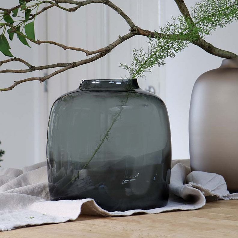 Warme tinten, mooie ronde vormen en kwalitatief sterk mond geblazen glaswerk. Deze lage vorm vaas van Vase...