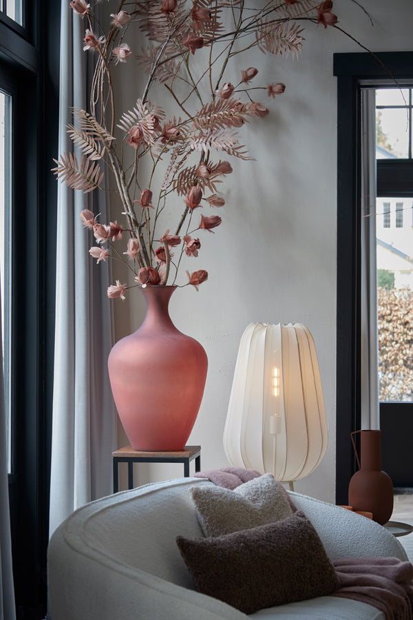 Plaats de vloerlamp naast een fauteuil of in een rustige hoek van je woonkamer voor een warme leeshoek. Combineer met natuurlijke materialen zoals hout en rotan, en voeg zachte kussens in aardtinten toe voor een harmonieus geheel. Perfect in combinatie met andere zandkleurige accenten om de warme uitstraling te versterken.